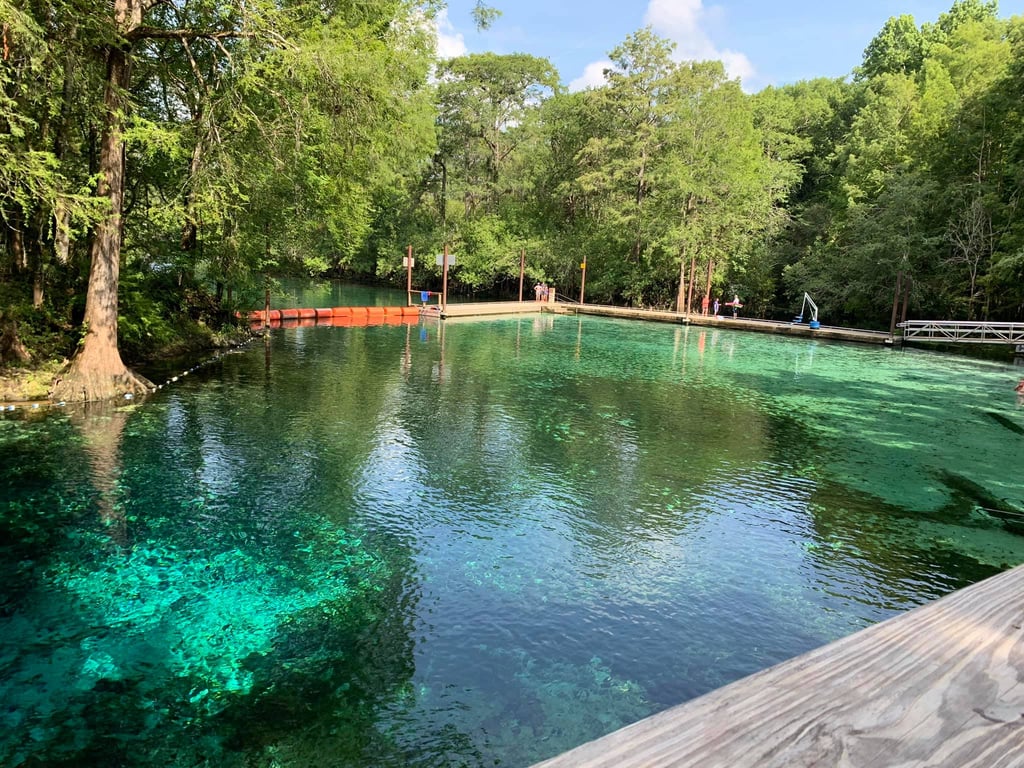 There are areas near the larger dock that are quite shallow and perfect for smaller kids. There are also shallow areas up near the bank. The middle and heading over to the spring head is deep. There is a diving platform, but it was closed for repairs. I personally was glad it was closed, because if people were jumping off of it then it would make snorkeling over the springs a bit dangerous and tricky, as they would be jumping right into that area. Without people diving, we were able to spend a lot of time snorkeling over the springs, which was beautiful! You could see the water bubbling up from the caverns below, as well as plenty of fish.