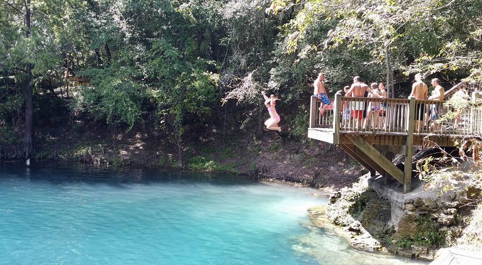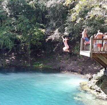You can walk into the spring at an end that is like a beach access, but there are big boulders and rocks that make it a little rough on the feet. Just beyond the boulders, the water is quite deep. I tried snorkeling, as I always do at the springs we visit, but there wasn't much to see. The water was so deep and dark that I wasn't able to see much. A popular thing to do there was to dive off the platform. I'm not a diver, but plenty of people were doing it (there were even a few who jumped out of trees). The dive platform may have since been removed, as many of them are being taken away for liability issues.